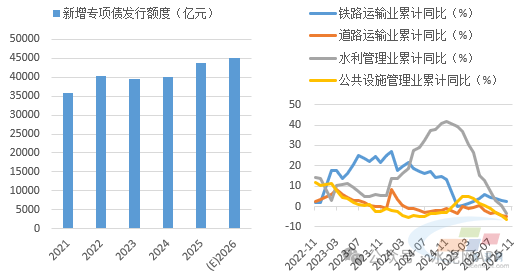基建方面,我們判斷2026年投資將回正,基建端水泥需求將有改善。“十五五”規(guī)劃建議指出,加強(qiáng)謀劃論證,實(shí)施一批重大標(biāo)志性工程項(xiàng)目,高質(zhì)量推進(jìn)國(guó)家重大戰(zhàn)略實(shí)施和重點(diǎn)領(lǐng)域安全能力項(xiàng)目建設(shè)。2026年作為“十五五”開局之年,預(yù)計(jì)專項(xiàng)債、超長(zhǎng)期特別國(guó)債發(fā)行規(guī)模將出現(xiàn)提高,基建投資將出現(xiàn)回正,但在化債政策影響下,水泥需求關(guān)系密切的交通類和市政基建投資或?qū)⒀永m(xù)低迷態(tài)勢(shì),預(yù)計(jì)基建整體對(duì)水泥需求支撐將有所改善,但力度可能仍然不強(qiáng)。