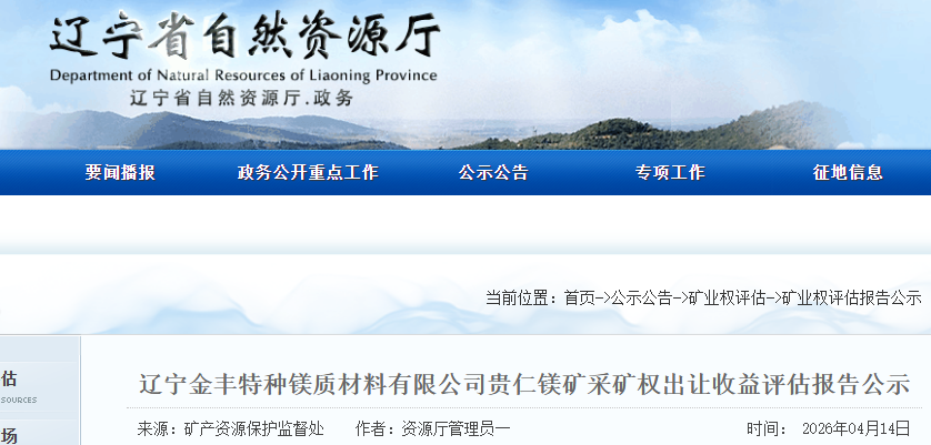 遼寧金豐特種鎂質(zhì)材料有限公司貴仁鎂礦采礦權(quán)出讓收益評(píng)估報(bào)告通過遼寧省自然資源廳門戶網(wǎng)站向社會(huì)公示,公示10個(gè)工作日。如有異議,請(qǐng)于公示之日起10個(gè)工作日內(nèi)以電話方式先向省自然資源廳礦產(chǎn)資源保護(hù)監(jiān)督處提出簡要意見,隨后及時(shí)將書面意見反饋到省自然資源廳礦產(chǎn)資源保護(hù)監(jiān)督處。